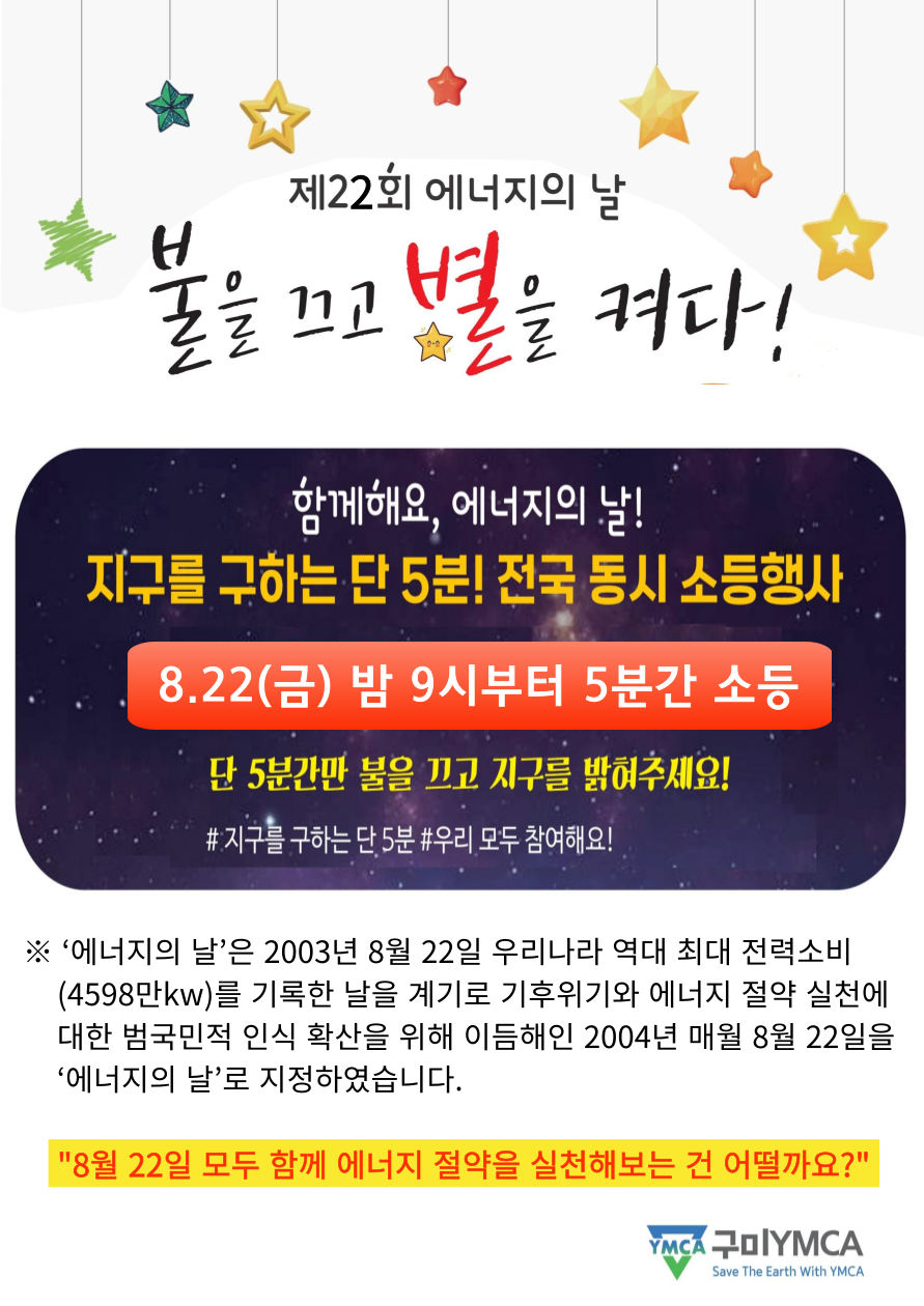 '제22회 에너지의 날'을 맞아 8월 22일(금) 밤 9시부터 5분간 전국 동시 소등행사가 진행됩니다.